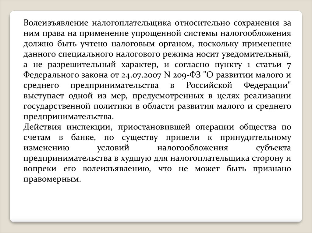 Волеизъявление налогоплательщика относительно сохранения заним права на применение упрощенной системы налогообложения