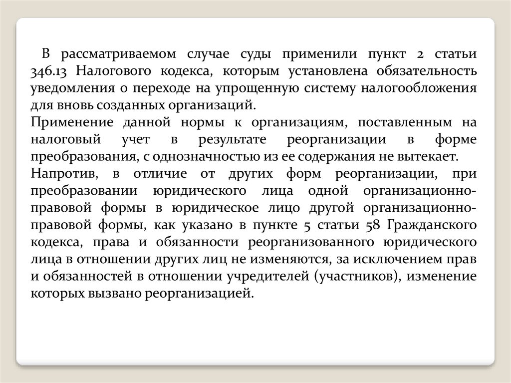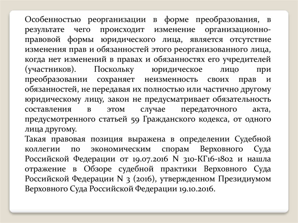 Особенностью реорганизации в форме преобразования, врезультате чего происходит изменение организационноправовой формы юридического лица, является отсутствие