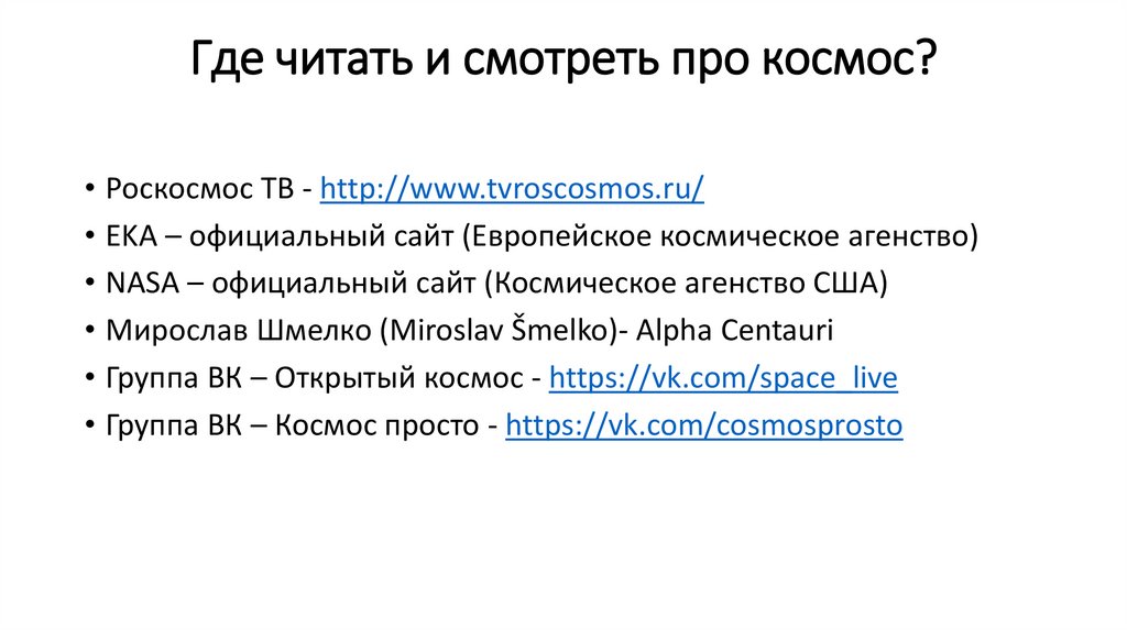 Где читать и смотреть про космос?• Роскосмос ТВ - http://www.tvroscosmos.ru/