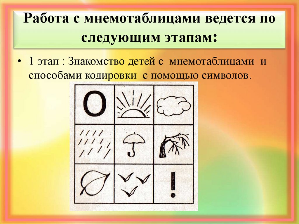 • 1 этап : Знакомство детей с мнемотаблицами и