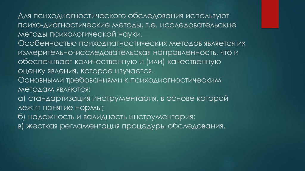 Для психодиагностического обследования используютпсихо-диагностические методы, т.е. исследовательские