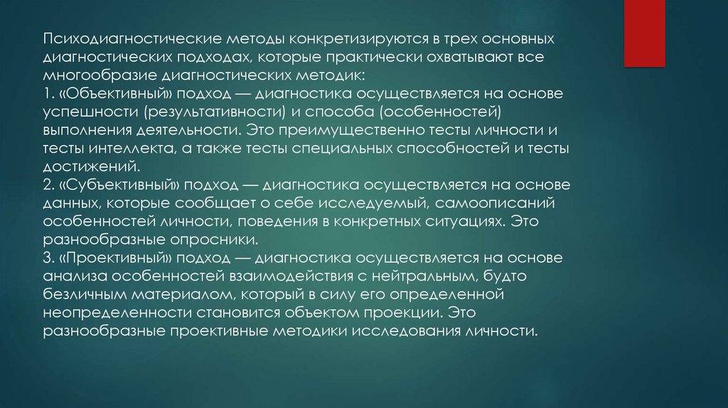 Психодиагностические методы конкретизируются в трех основныхдиагностических подходах, которые практически охватывают все