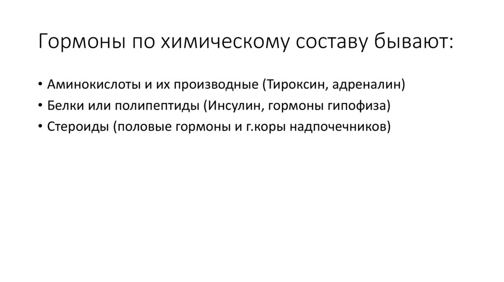 Гормоны по химическому составу бывают:• Аминокислоты и их производные (Тироксин, адреналин)