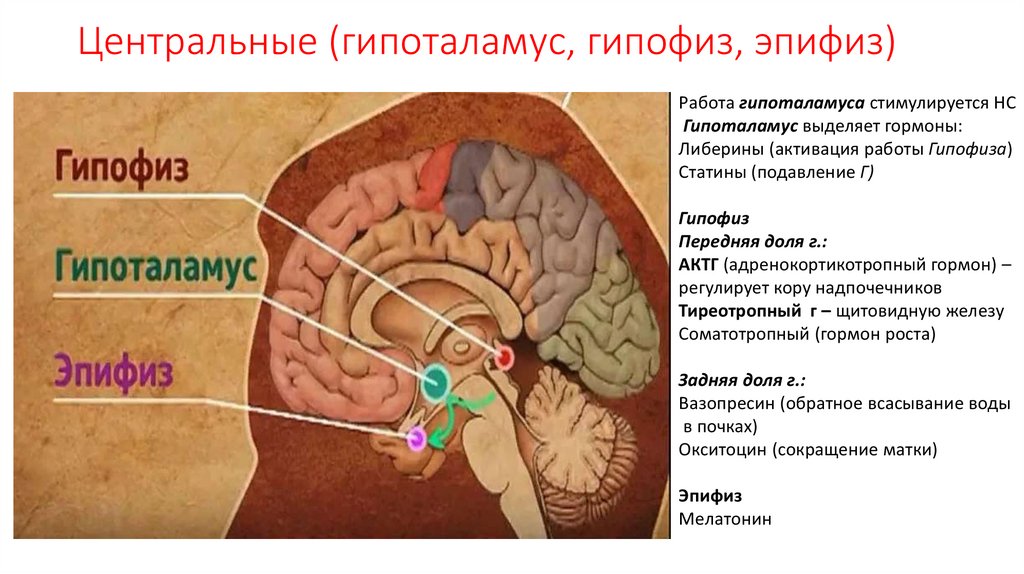 Центральные (гипоталамус, гипофиз, эпифиз)Работа гипоталамуса стимулируется НС
