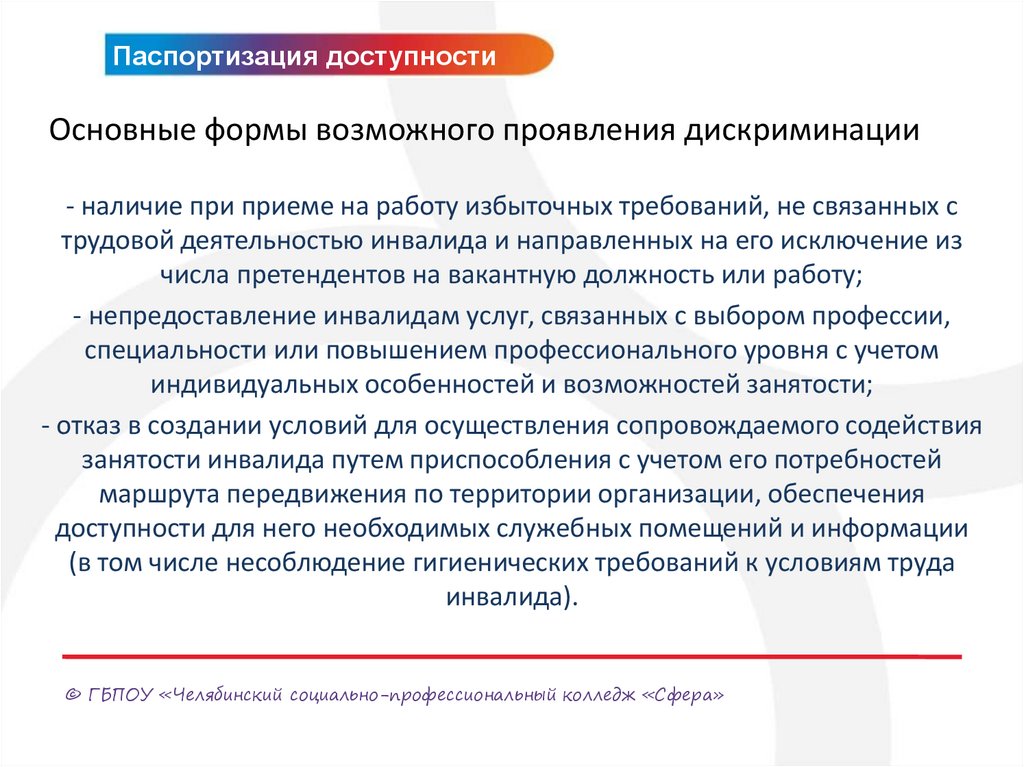 - непредоставление инвалидам услуг, связанных с выбором профессии,