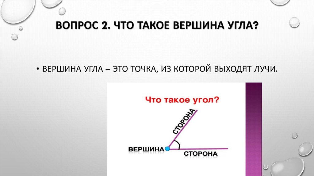 ВОПРОС 2. ЧТО ТАКОЕ ВЕРШИНА УГЛА?• ВЕРШИНА УГЛА – ЭТО ТОЧКА, ИЗ КОТОРОЙ ВЫХОДЯТ ЛУЧИ.
