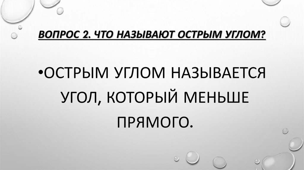 ВОПРОС 2. ЧТО НАЗЫВАЮТ ОСТРЫМ УГЛОМ?•ОСТРЫМ УГЛОМ НАЗЫВАЕТСЯ