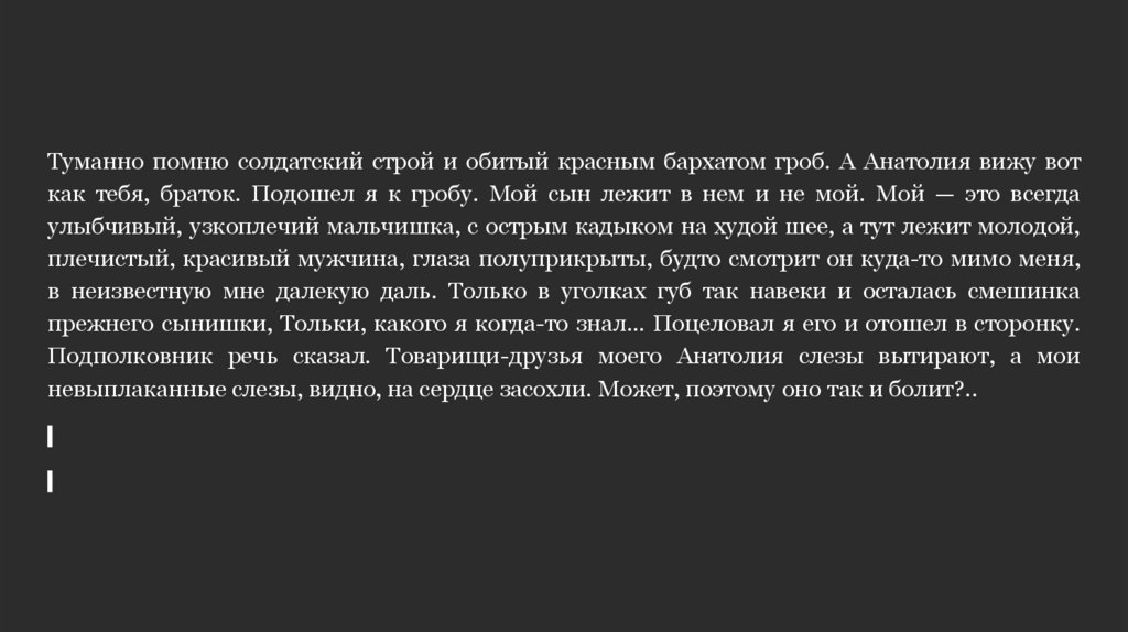Туманно помню солдатский строй и обитый красным бархатом гроб. А Анатолия вижу воткак тебя, браток. Подошел я к гробу. Мой сын лежит в нем и не мой. Мой — это всегда