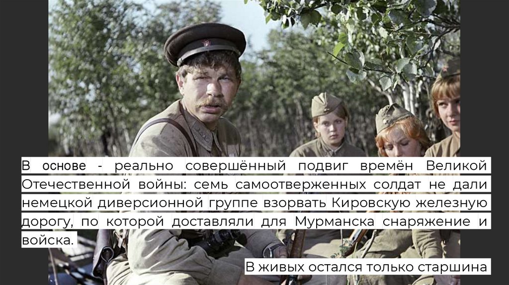 В основе - реально совершённый подвиг времён ВеликойОтечественной войны: семь самоотверженных солдат не дали