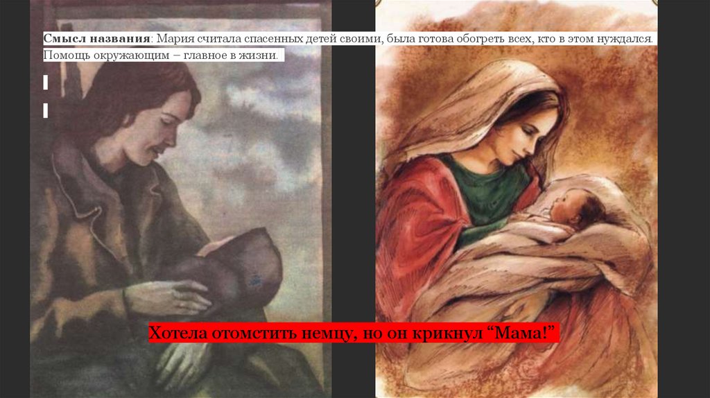 Смысл названия: Мария считала спасенных детей своими, была готова обогреть всех, кто в этом нуждался.Помощь окружающим – главное в жизни.