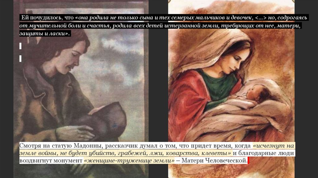 Ей почудилось, что «она родила не только сына и тех семерых мальчиков и девочек, <…> но, содрогаясьот мучительной боли и счастья, родила всех детей истерзанной земли, требующих от нее, матери,