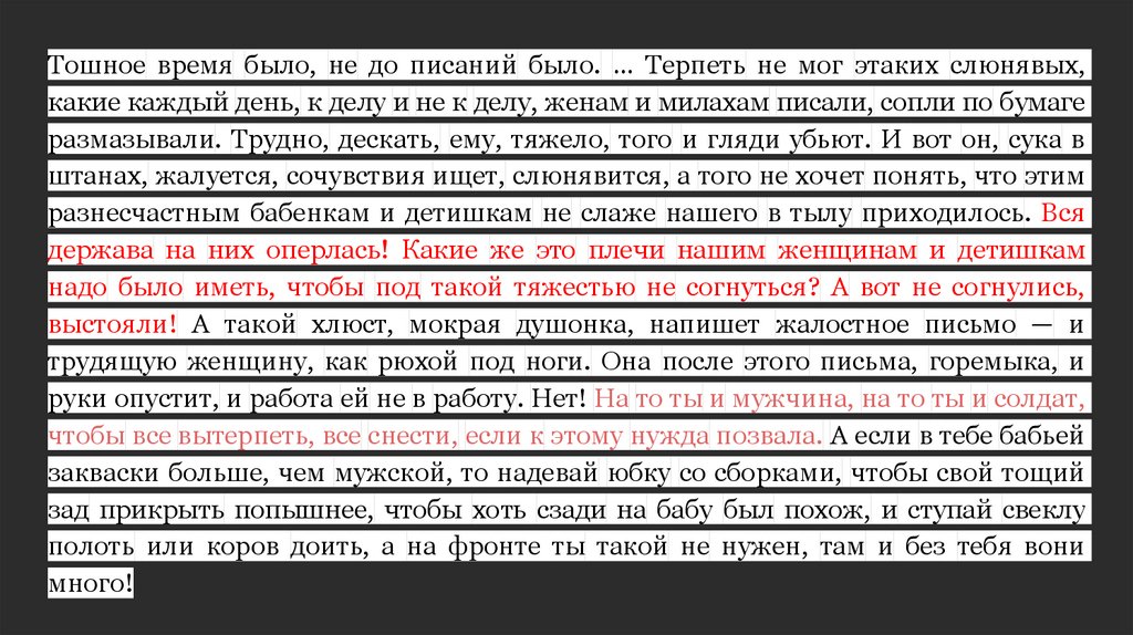 Тошное время было, не до писаний было. … Терпеть не мог этаких слюнявых,какие каждый день, к делу и не к делу, женам и милахам писали, сопли по бумаге