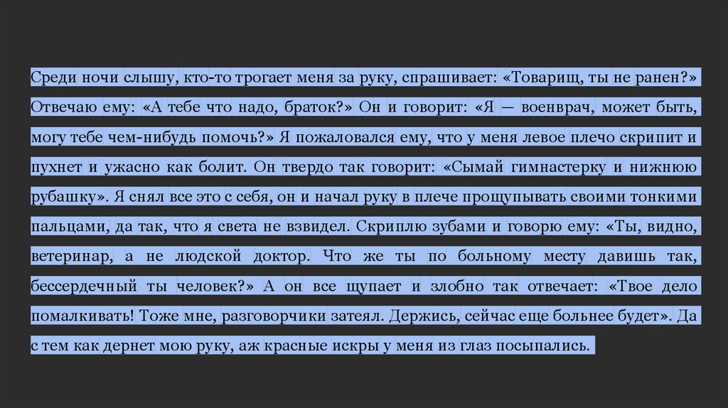 дальше пошел в темноте, потихоньку спрашивает: «Раненые есть?» Вот что значит