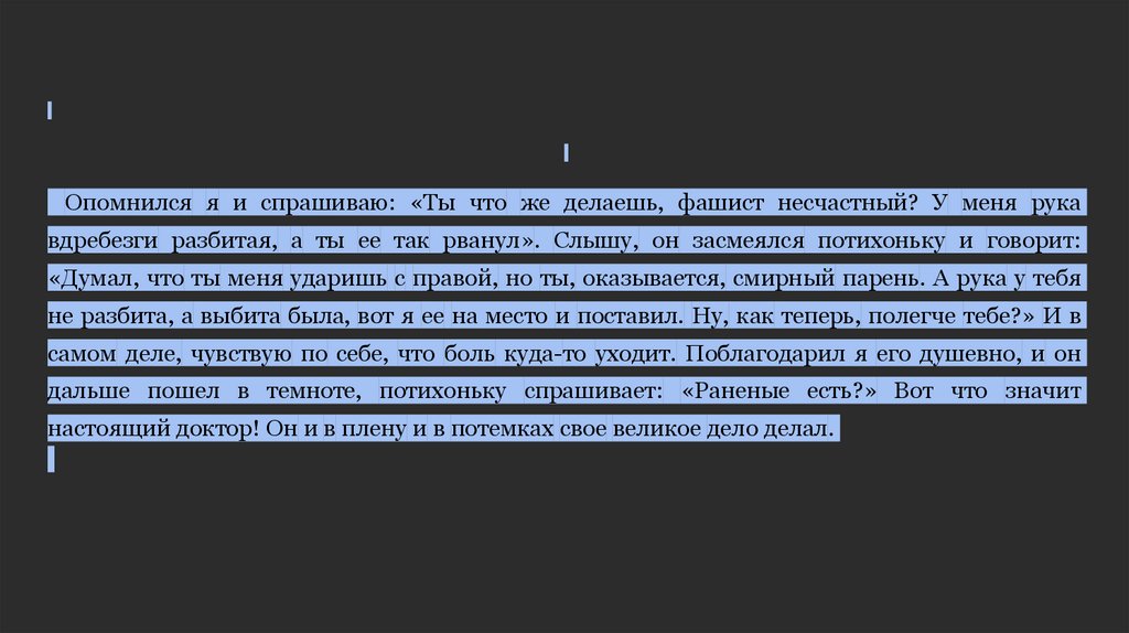Опомнился я и спрашиваю: «Ты что же делаешь, фашист несчастный? У меня рукавдребезги разбитая, а ты ее так рванул». Слышу, он засмеялся потихоньку и говорит: