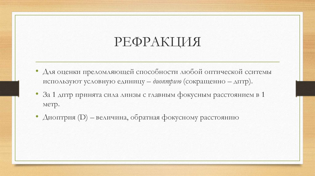 РЕФРАКЦИЯ• Для оценки преломляющей способности любой оптической сситемы