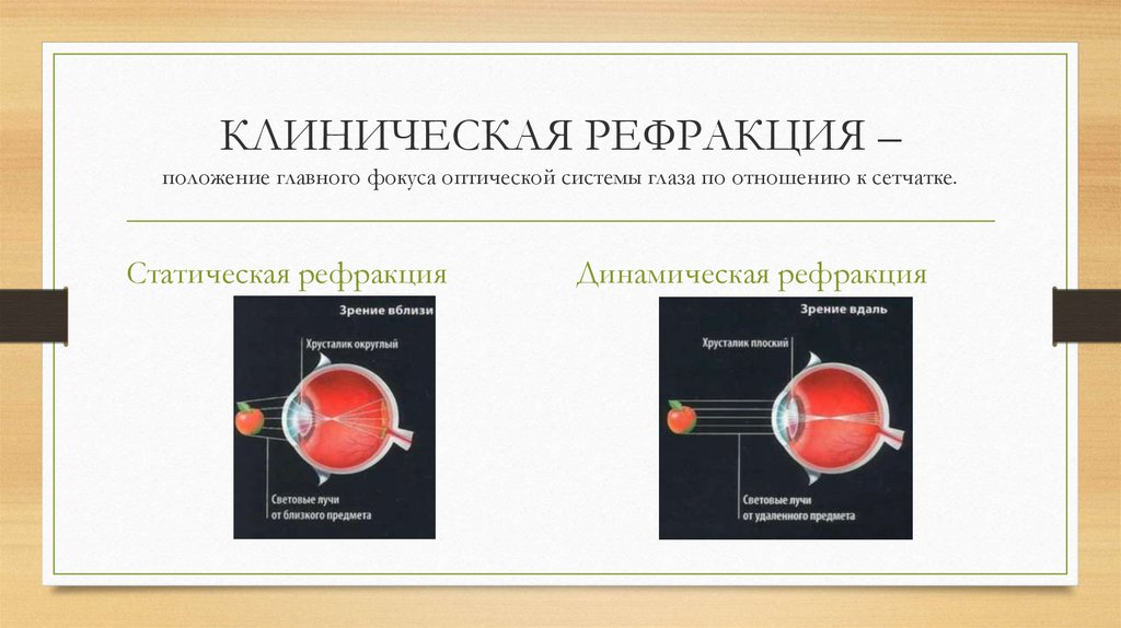 КЛИНИЧЕСКАЯ РЕФРАКЦИЯ –положение главного фокуса оптической системы глаза по отношению к сетчатке.