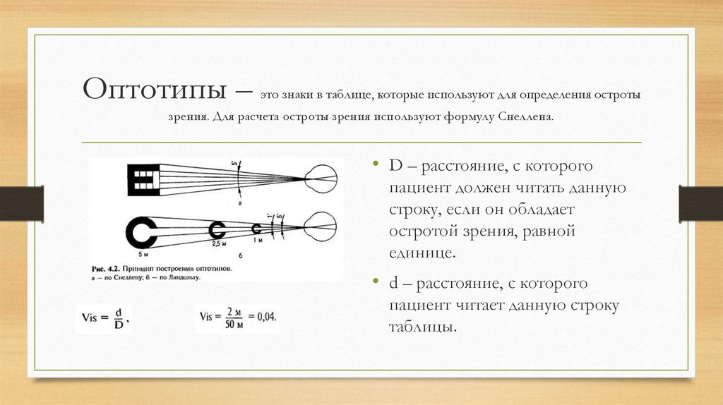 Оптотипы – это знаки в таблице, которые используют для определения остротызрения. Для расчета остроты зрения используют формулу Снеллена.