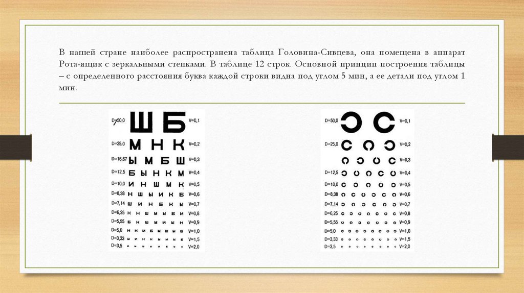 В нашей стране наиболее распространена таблица Головина-Сивцева, она помещена в аппаратРота-ящик с зеркальными стенками. В таблице 12 строк. Основной принцип построения таблицы