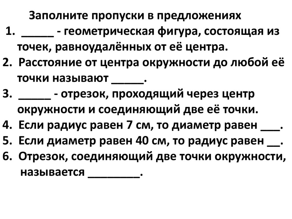 4. Если радиус равен 7 см, то диаметр равен ___.