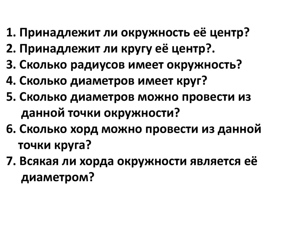 1. Принадлежит ли окружность её центр?2. Принадлежит ли кругу её центр?.