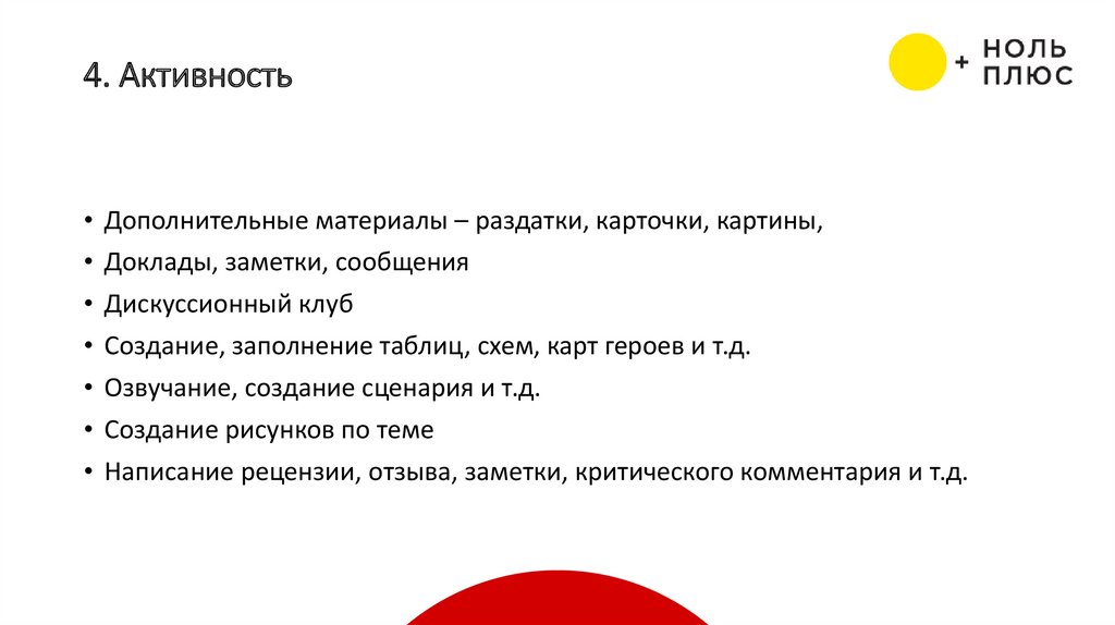 4. Активность• Дополнительные материалы – раздатки, карточки, картины,