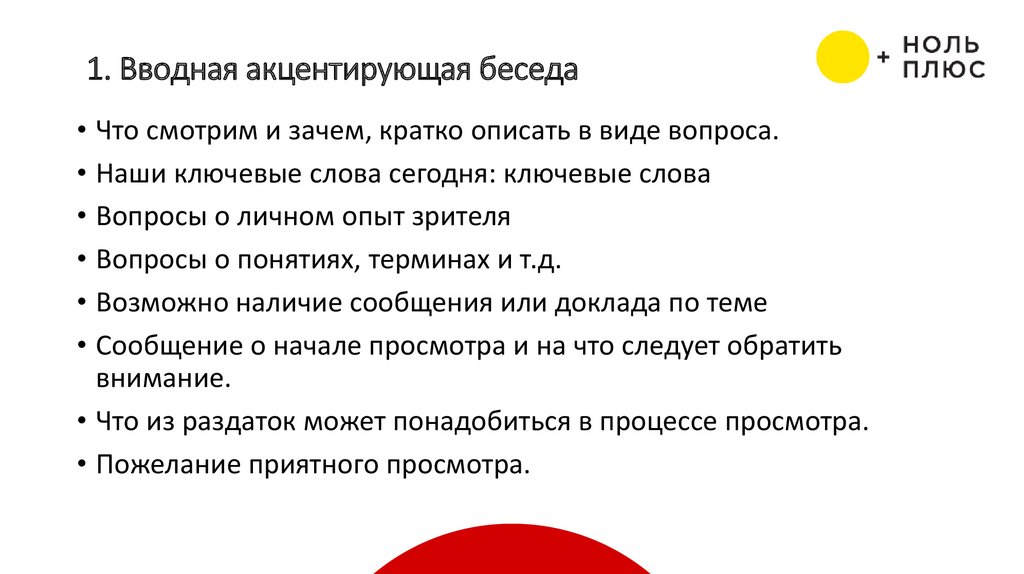 1. Вводная акцентирующая беседа• Что смотрим и зачем, кратко описать в виде вопроса.