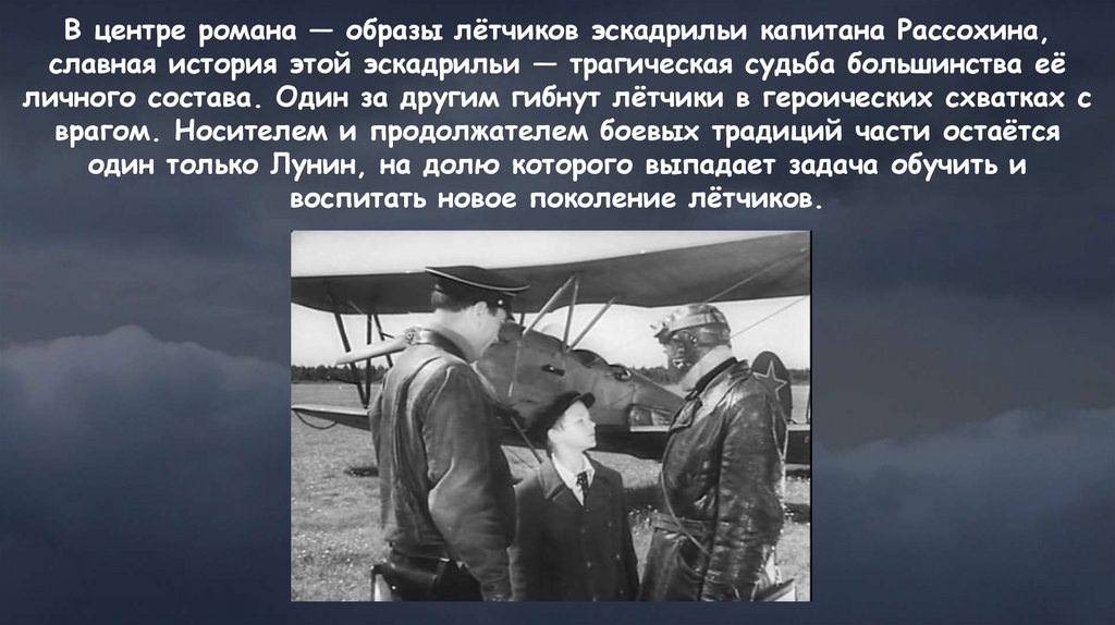 В центре романа — образы лётчиков эскадрильи капитана Рассохина,славная история этой эскадрильи — трагическая судьба большинства её