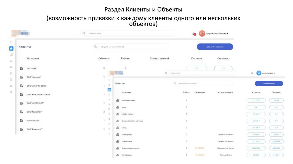 Раздел Клиенты и Объекты(возможность привязки к каждому клиенты одного или нескольких