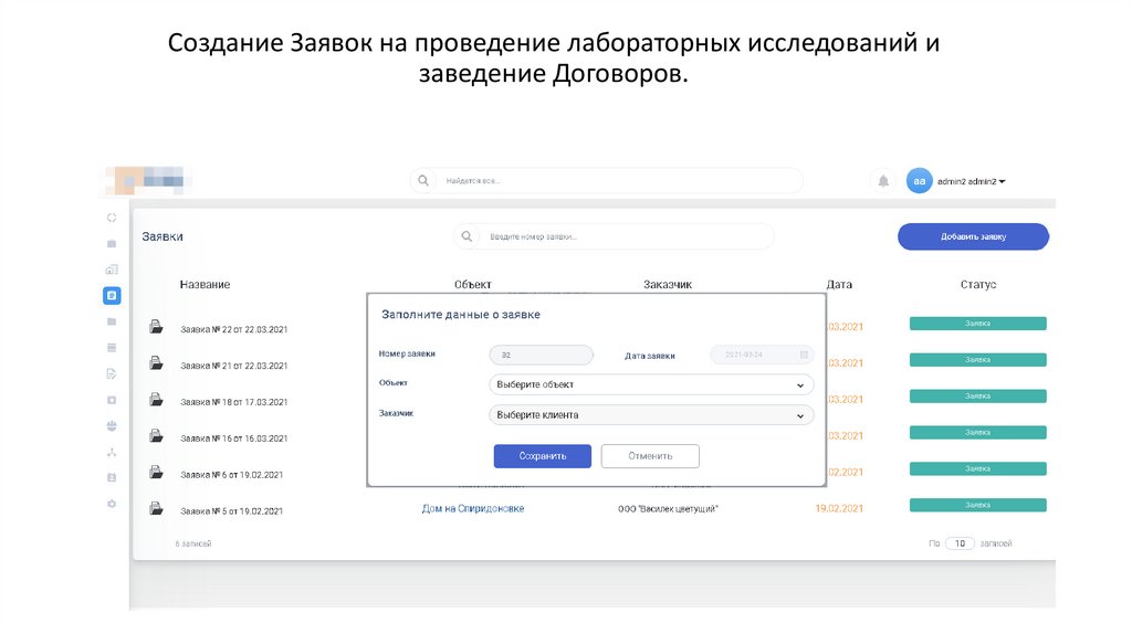 Создание Заявок на проведение лабораторных исследований изаведение Договоров.