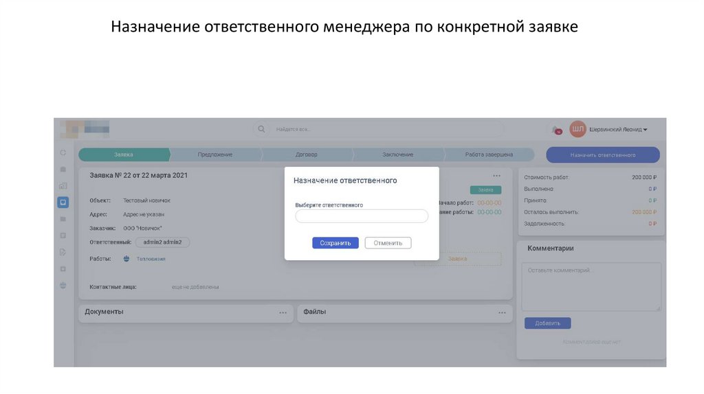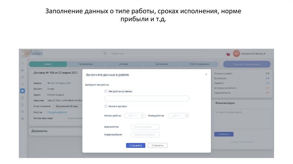 Заполнение данных о типе работы, сроках исполнения, нормеприбыли и т.д.