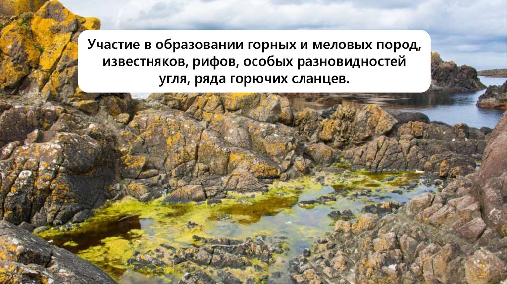 Участие в образовании горных и меловых пород,известняков, рифов, особых разновидностей