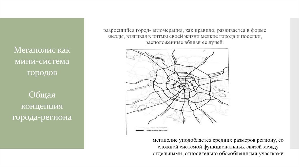разросшийся город- агломерация, как правило, развивается в формезвезды, втягивая в ритмы своей жизни мелкие города и поселки,