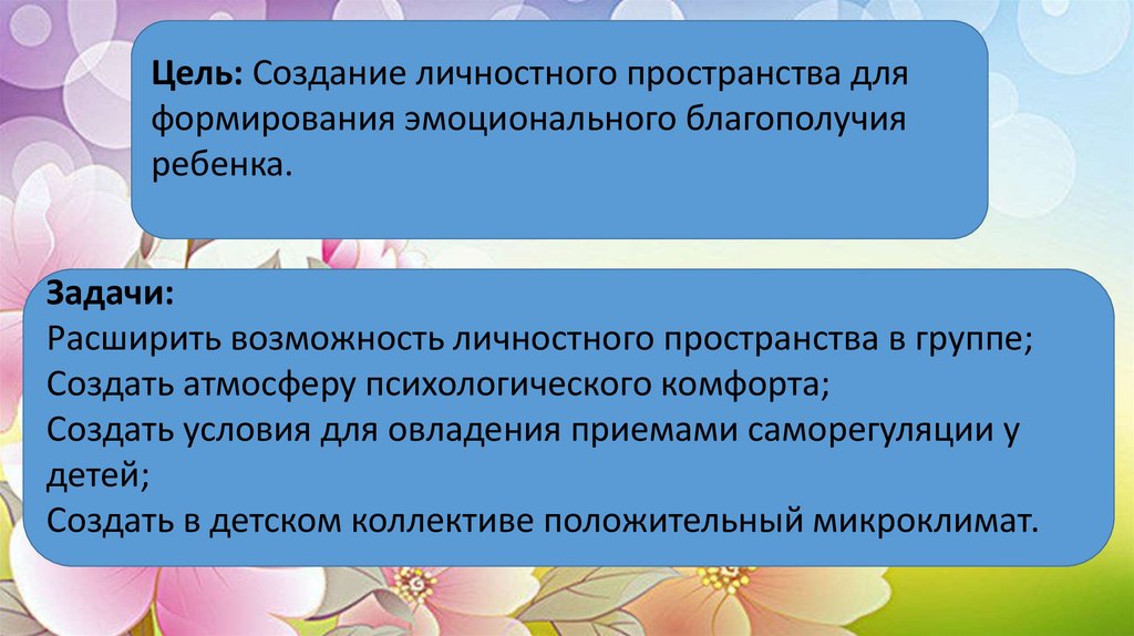 Цель: Создание личностного пространства дляформирования эмоционального благополучия