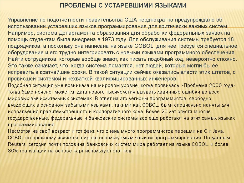 ПРОБЛЕМЫ С УСТАРЕВШИМИ ЯЗЫКАМИУправление по подотчетности правительства США неоднократно предупреждало об