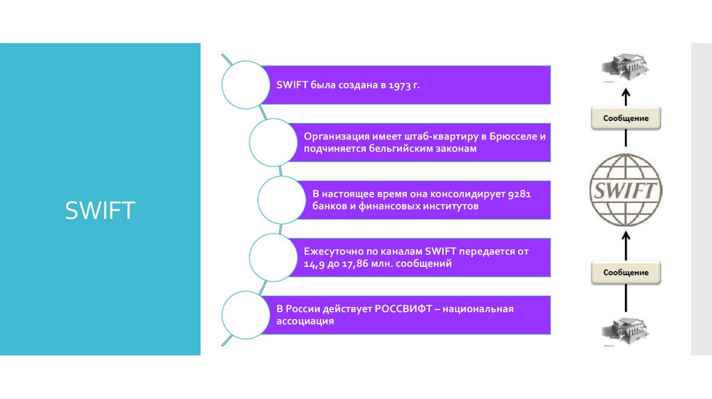SWIFT была создана в 1973 г.Организация имеет штаб-квартиру в Брюсселе и