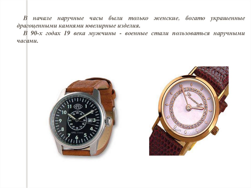 В начале наручные часы были только женские, богато украшенныедрагоценными камнями ювелирные изделия.