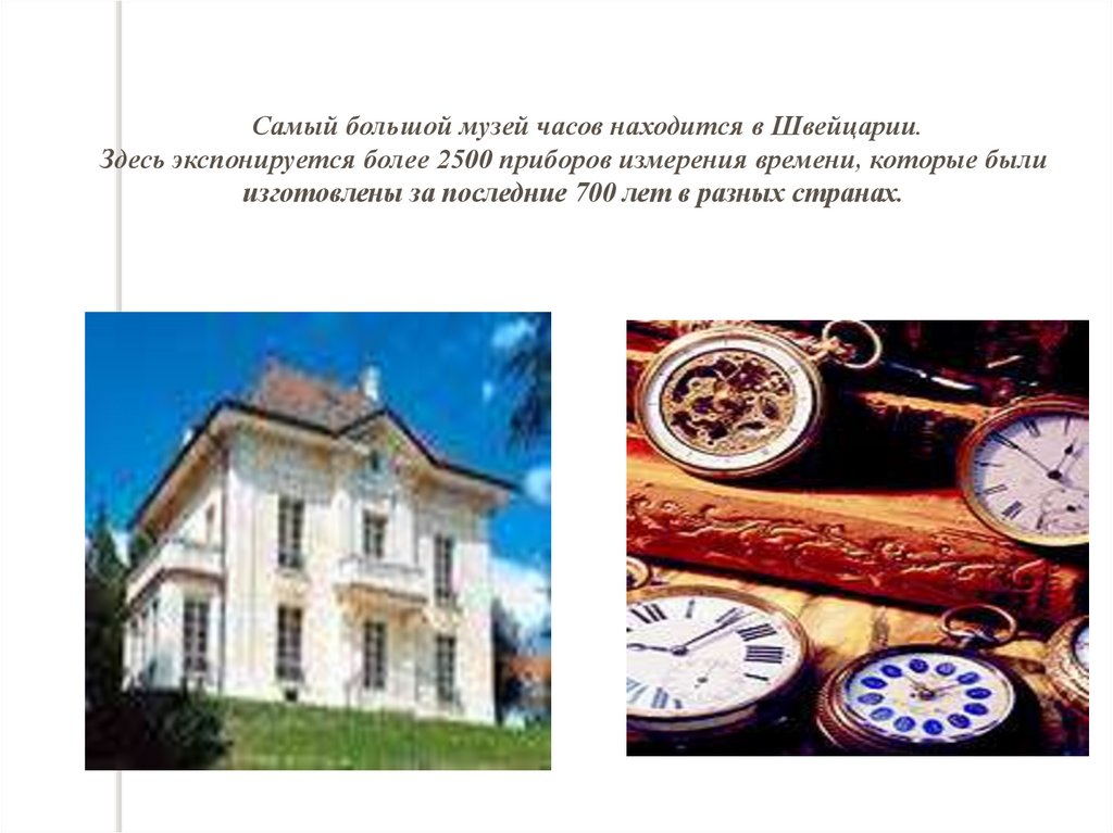 Самый большой музей часов находится в Швейцарии.Здесь экспонируется более 2500 приборов измерения времени, которые были