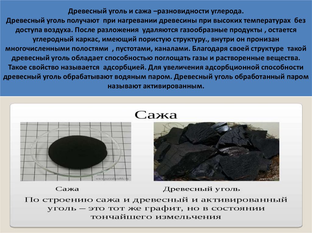 Древесный уголь и сажа –разновидности углерода.Древесный уголь получают при нагревании древесины при высоких температурах без