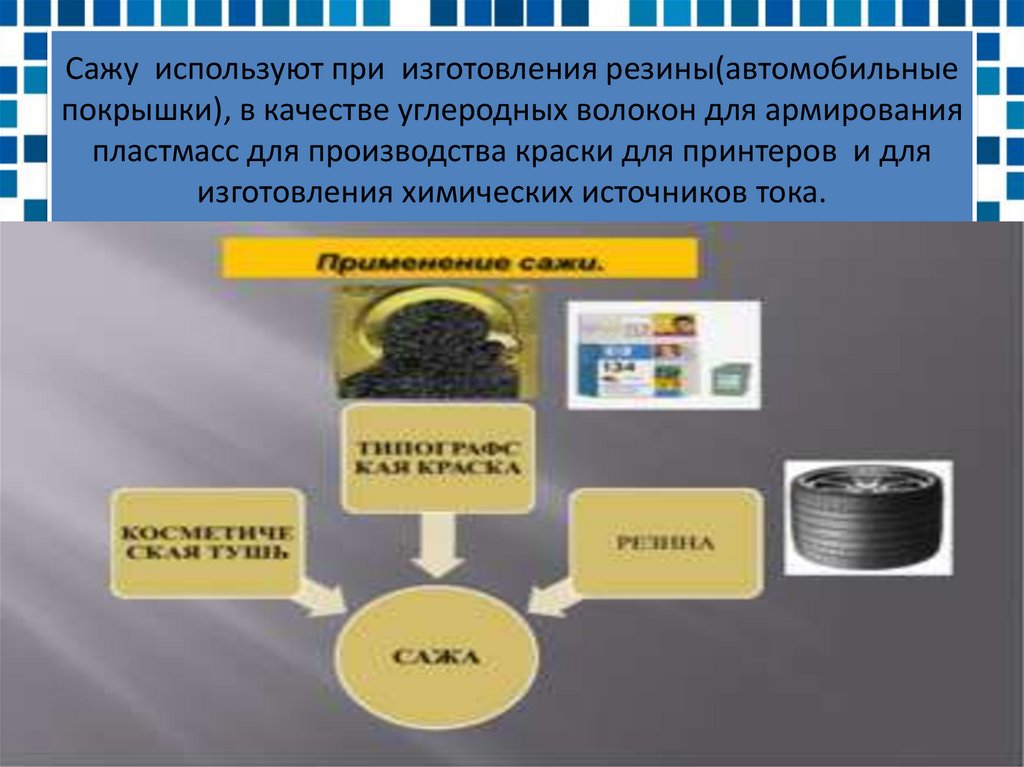 Сажу используют при изготовления резины(автомобильныепокрышки), в качестве углеродных волокон для армирования