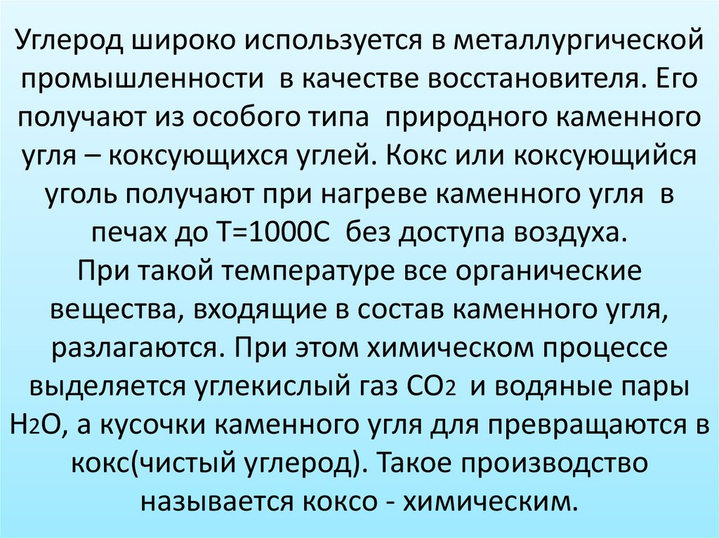 Углерод широко используется в металлургическойпромышленности в качестве восстановителя. Его