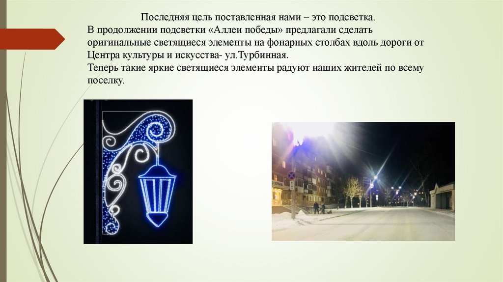Последняя цель поставленная нами – это подсветка.В продолжении подсветки «Аллеи победы» предлагали сделать