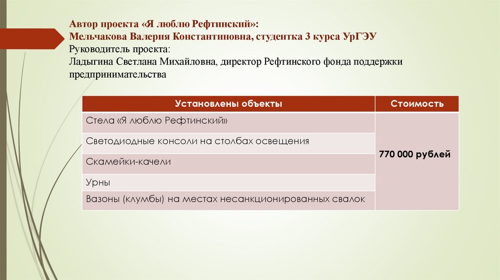 Автор проекта «Я люблю Рефтинский»:Мельчакова Валерия Константиновна, студентка 3 курса УрГЭУ