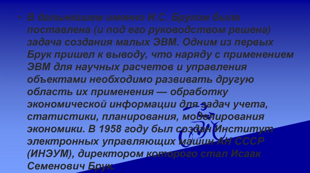 • В дальнейшем именно И.С. Бруком былапоставлена (и под его руководством решена)