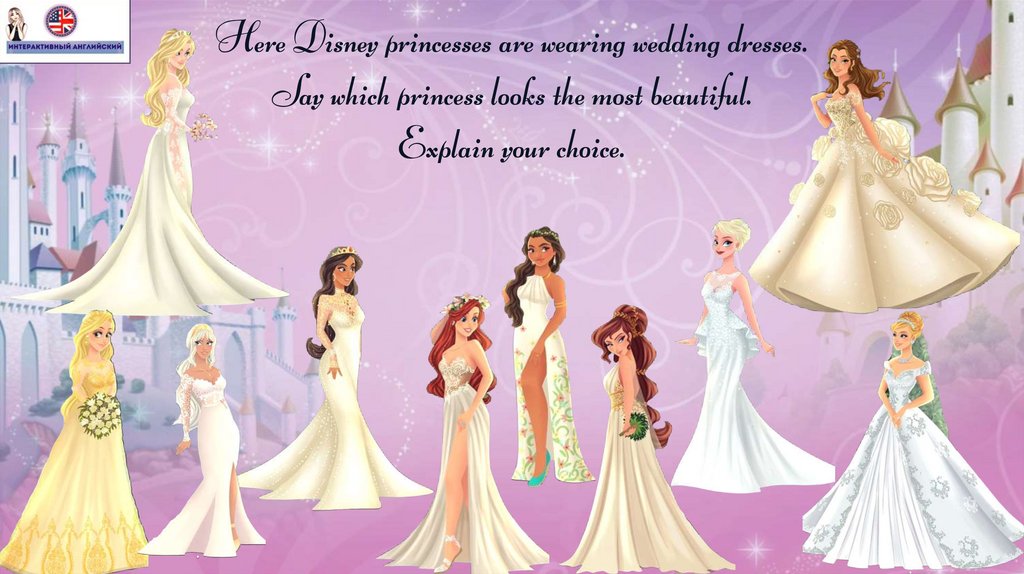 Here Disney princesses are wearing wedding dresses.Say which princess looks the most beautiful.