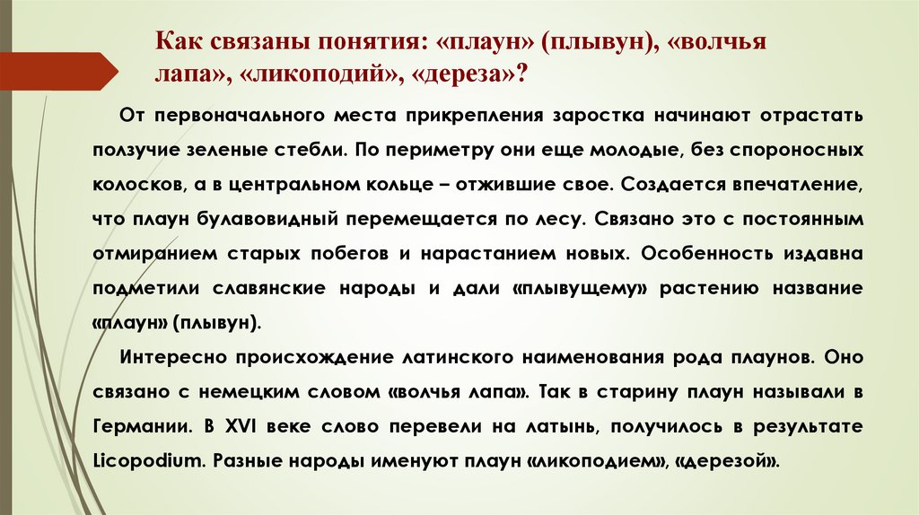 Как связаны понятия: «плаун» (плывун), «волчья лапа», «ликоподий», «дереза»?