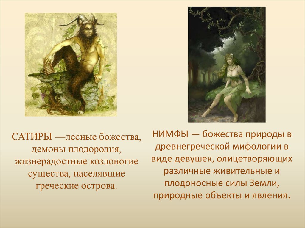 САТИРЫ —лесные божества, НИМФЫ — божества природы вдревнегреческой мифологии в