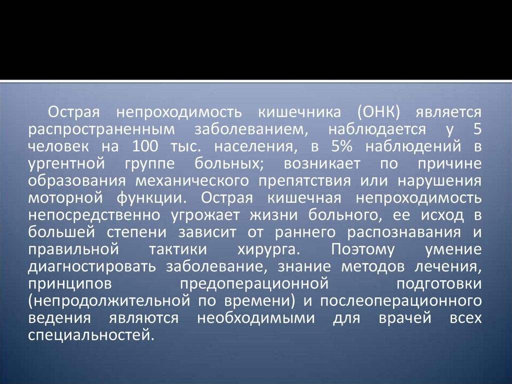 Острая непроходимость кишечника (ОНК) являетсяраспространенным заболеванием, наблюдается у 5
