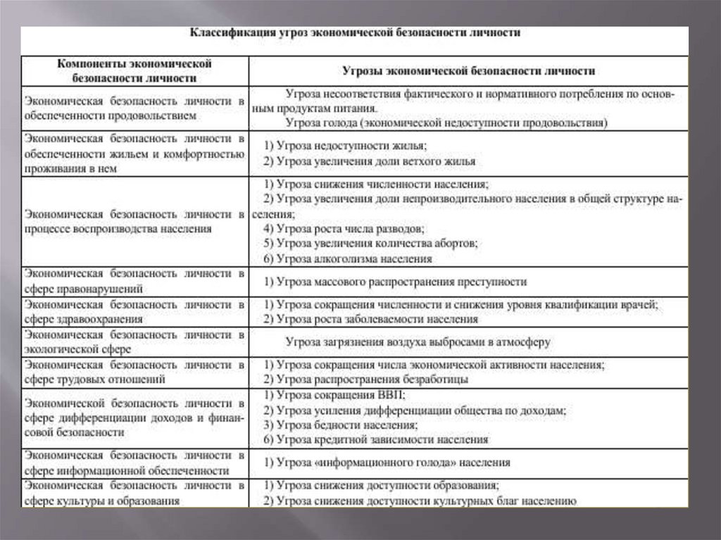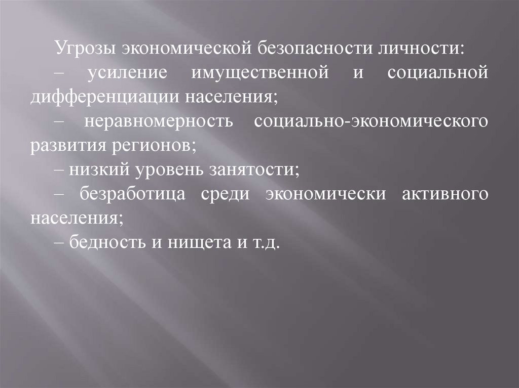 Угрозы экономической безопасности личности:– усиление имущественной и социальной