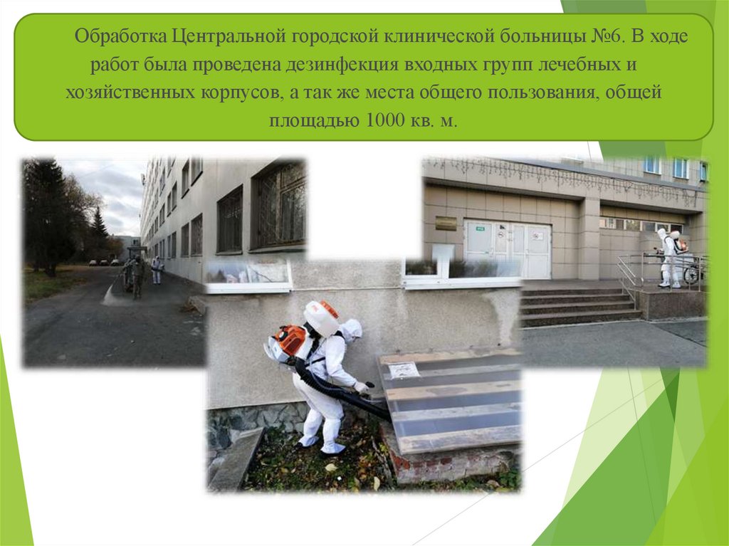 Обработка Центральной городской клинической больницы №6. В ходеработ была проведена дезинфекция входных групп лечебных и