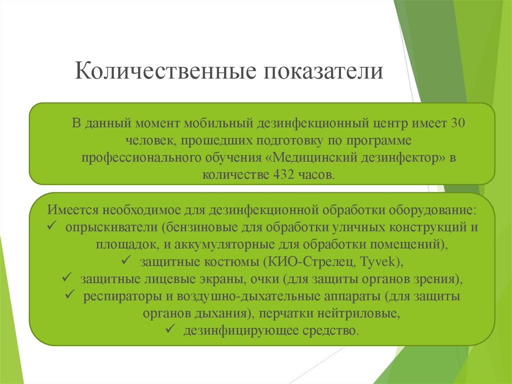 Количественные показателиВ данный момент мобильный дезинфекционный центр имеет 30